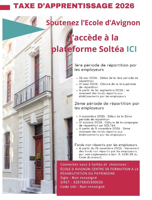 Les formations dispensées à l’École d’Avignon visent à adapter les professionnels aux spécificités du marché de la réhabilitation (matériaux, techniques, entretien/réparation) en intégrant une démarche d’intervention durable, proposant ainsi des méthodes, outils et techniques traditionnelles permettant d’intégrer et transmettre les nouvelles exigences du marché de la réhabilitation.
